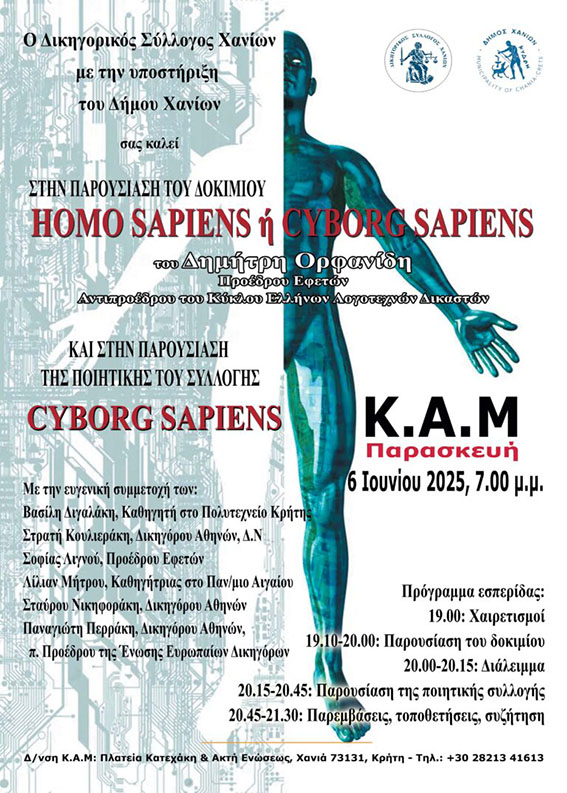 «Homo Sapiens ή Cyborg Sapiens». Παράλληλα, θα παρουσιαστεί και η ποιητική συλλογή του συγγραφέα, με τίτλο «Cyborg Sapiens».