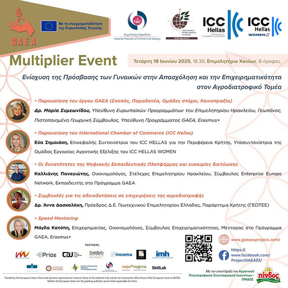 Το Επιμελητήριο Ηρακλείου συμμετέχει ως εταίρος στο ευρωπαϊκό πρόγραμμα GAEA (Granting Access to Employment and Entrepreneurship in Agriculture for Women), το οποίο έχει στόχο να ενισχύσει τη συμμετοχή των γυναικών στον αγροτικό τομέα, δίνοντάς τους πρόσβαση σε γνώσεις, εργαλεία και ευκαιρίες για απασχόληση και επιχειρηματική δράση στην ύπαιθρο.
