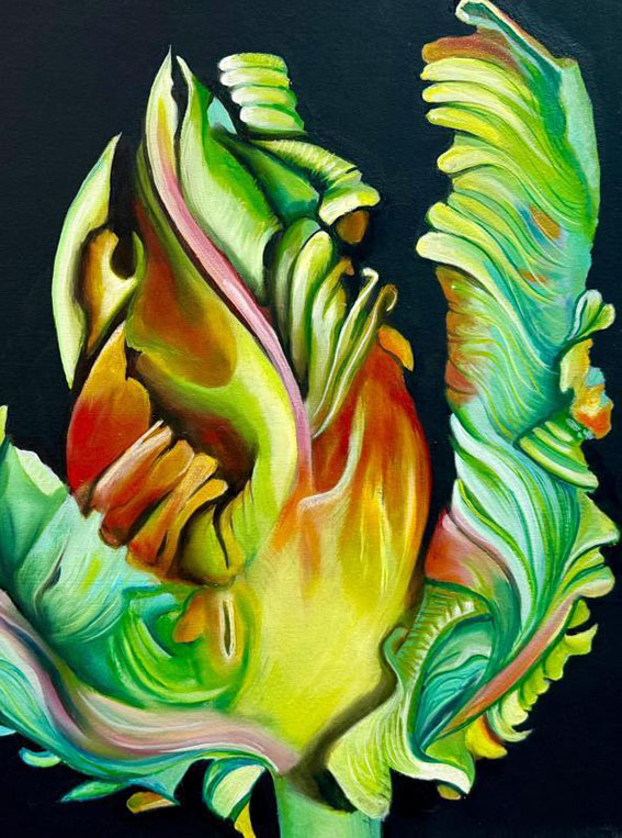 Το μοτίβο της τουλίπας στη ζωγραφική έχει μια μακρά και ενδιαφέρουσα ιστορία – ειδικά στην ολλανδική τέχνη του 17ου αιώνα. Οι τουλίπες ως λουλούδια με πλούσιο συμβολισμό (έρωτας, άνοιξη, αισθησιασμός, ομορφιά, πλούτος, εξωτισμός, αλλά και παροδικότητα) στην Μαλινόφσκι αποτελούν την πεμπτουσία της λαμπρότητας των χρωμάτων και των προσεκτικά απεικονισμένων σχημάτων που χτίζουν την ενέργεια του πίνακα.