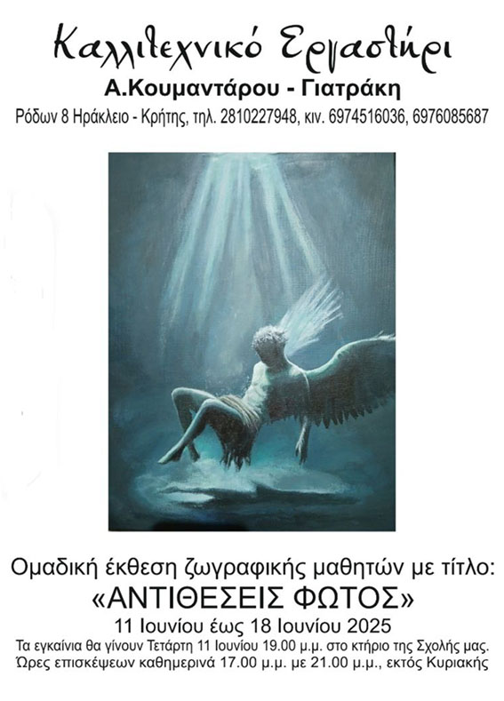 Η έκθεση θα διαρκέσει ως τις 18 Ιουνίου 2025 στο χώρο της Σχολής Καλλιτεχνικό Εργαστήρι Α. Κουμάνταρου – Γιατράκη, Ρόδων 8, Ηράκλειο, με ελεύθερη είσοδο για το κοινό καθημερινά εκτός Κυριακής από τις 17:00 – 21:30.