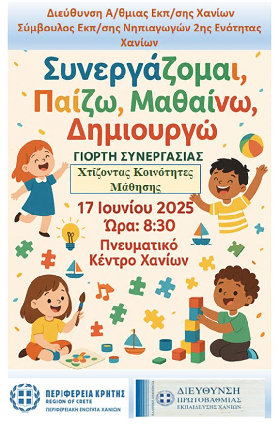 Στο πλαίσιο της συνεργασίας, της δημιουργικότητας και της αδελφοποίησης ομάδων νηπιαγωγείων θα παρουσιαστούν καλές πρακτικές 25 Νηπιαγωγείων με πρωταγωνιστή το παιχνίδι.