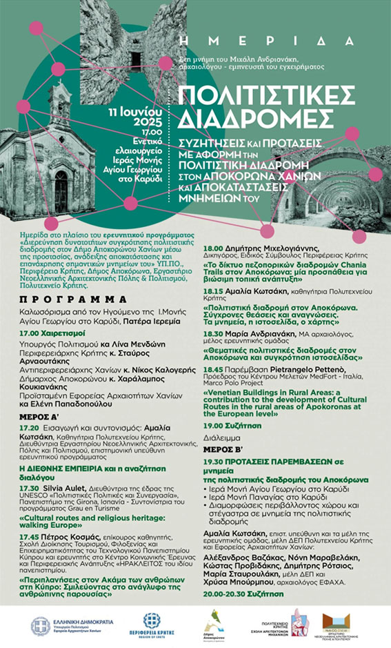 Η ημερίδα με τίτλο «Πολιτιστικές Διαδρομές: Συζητήσεις και Προτάσεις με αφορμή την Πολιτιστική Διαδρομή στον Αποκόρωνα Χανίων και αποκαταστάσεις μνημείων του» που θα πραγματοποιηθεί την