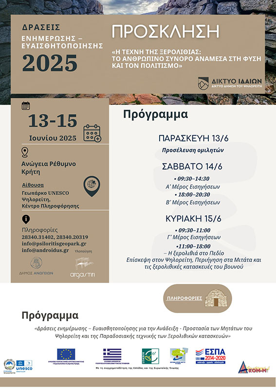 Συνέδριο με θέμα «Η Τέχνη της Ξερολιθιάς: Το ανθρώπινο σύνορο ανάμεσα στη φύση και τον πολιτισμό», θα πραγματοποιηθεί στα Ανώγεια, στην αίθουσα «Γιώργης Κλάδος» του ΑΚΟΜΜ-ΨΗΛΟΡΕΙΤΗΣ ΑΑΕ ΟΤΑ–Κέντρου Πληροφόρησης του Παγκόσμιου Γεωπάρκου Unesco Ψηλορείτη στις