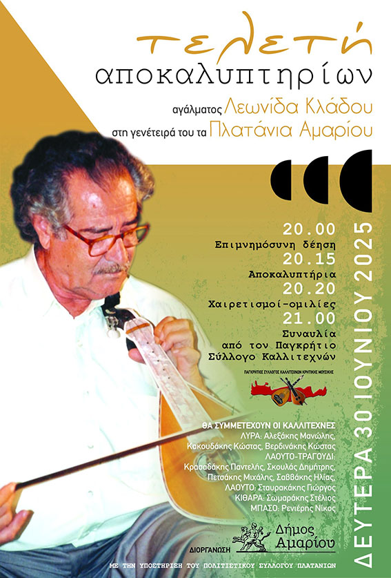 Με σεβασμό και συγκίνηση, ο Δήμος Αμαρίου διοργανώνει την τελετή αποκαλυπτηρίων του αγάλματος του μεγάλου λυράρη και δημιουργού της κρητικής μουσικής, Λεωνίδα Κλάδου, στην ιδιαίτερη πατρίδα του, τα Πλατάνια Ρεθύμνου.