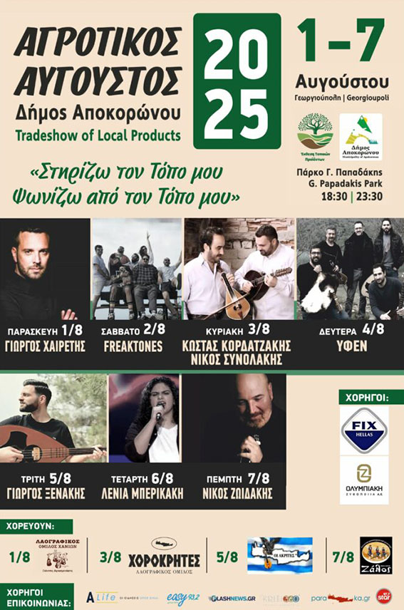 Ο Δήμος Αποκορώνου δίνει για μια ακόμη χρονιά δυναμικά το «παρών» στον θεσμό του Αγροτικού Αυγούστου 2025, ο οποίος θα πραγματοποιηθεί από την