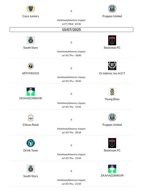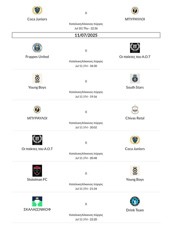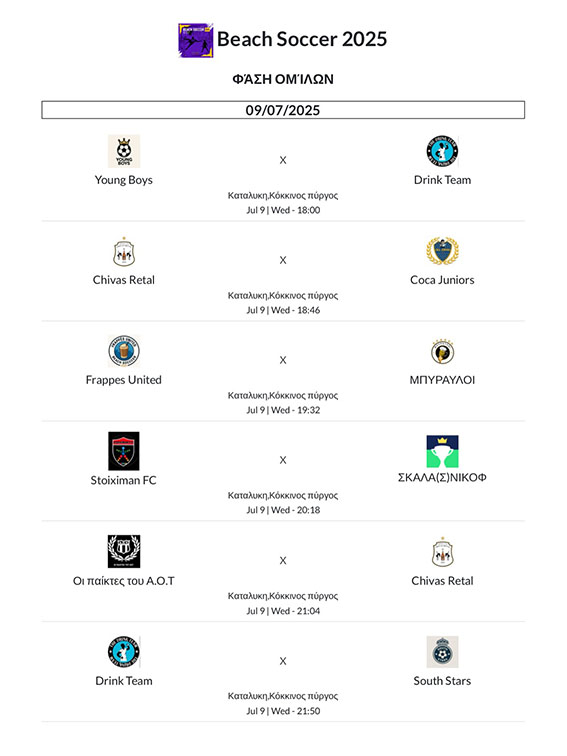 Η αυλαία της διοργάνωσης ανοίγει στις 9/7 στις 18:00 με την αναμέτρηση Young Boys – Drink Team, δίνοντας το στίγμα για ένα τετραήμερο γεμάτο συναρπαστικούς αγώνες, ενθουσιασμό και ελεύθερο καλοκαιρινό ρυθμό.