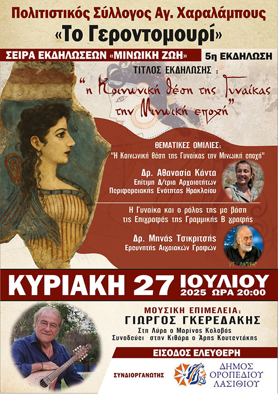 Ο Πολιτιστικός Σύλλογος Αγίου Χαραλάμπους «Το Γεροντομουρί» διοργανώνει, όπως κάθε χρόνο, την καθιερωμένη πολιτιστική εκδήλωση της τελευταίας Κυριακής του Ιουλίου, προσκαλώντας το κοινό σε μια βραδιά αφιερωμένη στη γυναίκα της Μινωικής εποχής.