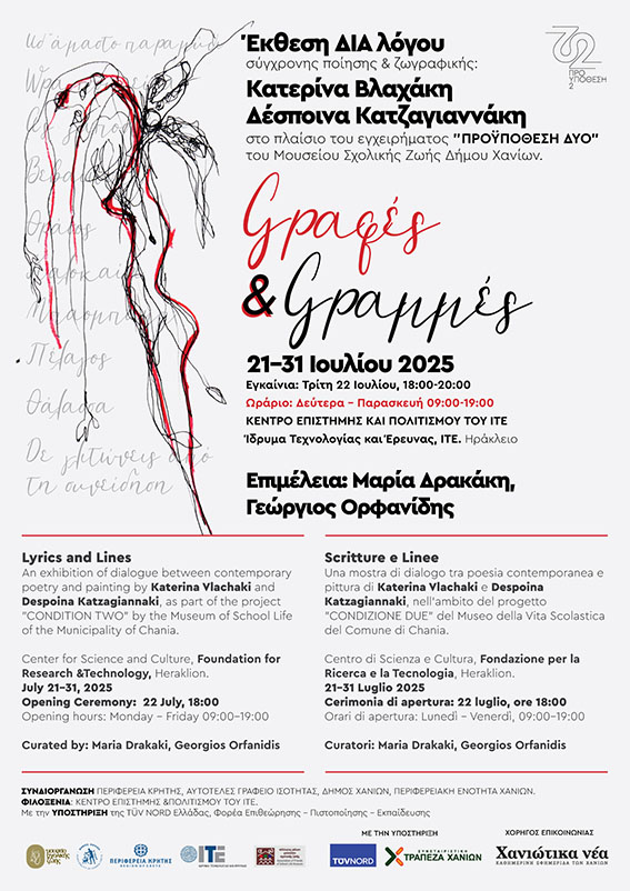 Το Μουσείο Σχολικής Ζωής του Δήμου Χανίων παρουσιάζει με περηφάνια την εικαστική έκθεση «Γραφές & Γραμμές», στο πλαίσιο του επιτυχημένου εγχειρήματος «ΠΡΟΫΠΟΘΕΣΗ ΔΥΟ», μια πρωτοβουλία που εξερευνά δημιουργικές δυάδες και τον δυναμικό διάλογο μεταξύ διαφορετικών καλλιτεχνικών εκφράσεων.