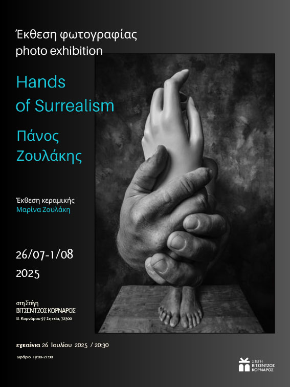 Ο Πάνος Ζουλάκης, στην ατομική του έκθεση με τίτλο “Hands of Surrealism”, παρουσιάζει το νέο φωτογραφικό έργο του, που αποτελεί μια εξερεύνηση του ανοίκειου στην ανθρώπινη μορφή μέσα από το πρίσμα ενός υπερευρυγώνιου φακού. Αναζητά την αποδόμηση και επανασύνθεση του ανθρώπινου σώματος, ώστε να αποκαλυφθούν πτυχές που κρύβονται πίσω από την οικειότητα της καθημερινότητας.