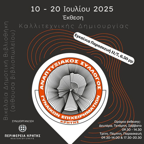 Ο Αναπτυξιακός Σύλλογος Γυναικών Επιχειρηματιών Κρήτης (ΑΣΓΕΚ) διοργανώνει μια ξεχωριστή εικαστική έκθεση με θέμα «Γυναικεία Επιχειρηματικότητα στο Σήμερα και στο Χθες», η οποία θα πραγματοποιηθεί από τις