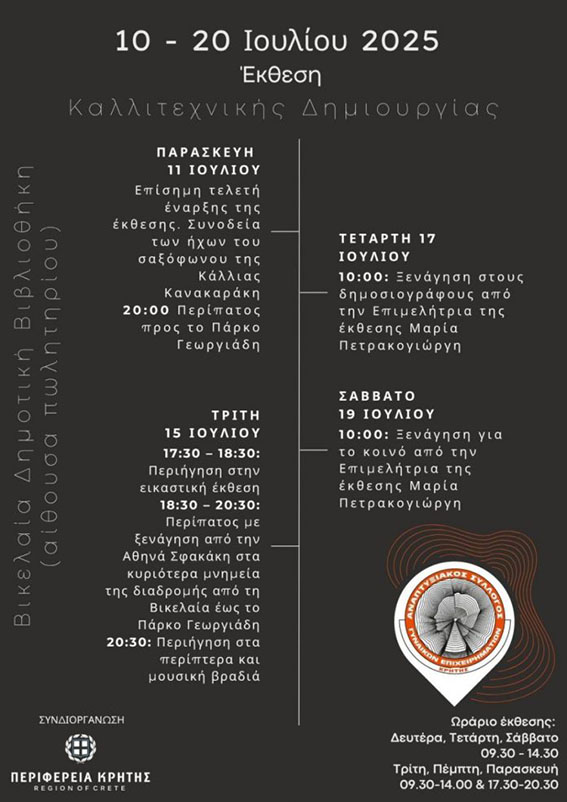 Η έκθεση υλοποιείται με τη στήριξη της Περιφέρειας Κρήτης και της Αντιπεριφερειάρχη Πολιτισμού και Ισότητας, κας Μηλάκη.