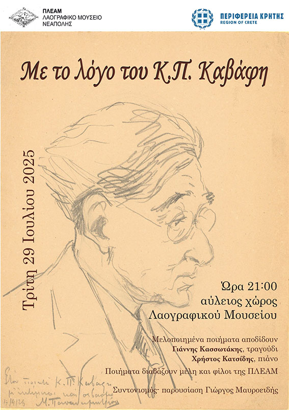Η ΠΛΕΑΜ (Πολιτιστική Λέσχη Εκπαιδευτικών Λασιθίου) παρουσιάζει μια βραδιά αφιερωμένη στον διαχρονικό ποιητικό λόγο του Κωνσταντίνου Π. Καβάφη, την
