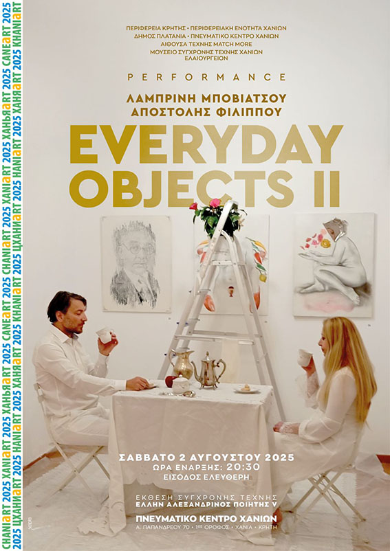 Η performance “Everyday Objects II” και η ξενάγηση αποτελούν παράλληλες δράσεις της έκθεσης σύγχρονης τέχνης «Έλλην Αλεξανδρινός Ποιητής V», που συνδιοργανώνεται από την Περιφέρεια Κρήτης – Περιφερειακή Ενότητα Χανίων, τo Δήμο Πλατανιά, το Πνευματικό Κέντρο Χανίων, την Αίθουσα Τέχνης Match More, το Μουσείο Σύγχρονης Τέχνης Χανίων Ελαιουργείον και εντάσσεται στο πρόγραμμα «ΧΑΝΙaRT 2025 – Εικαστικές Διαδρομές».
