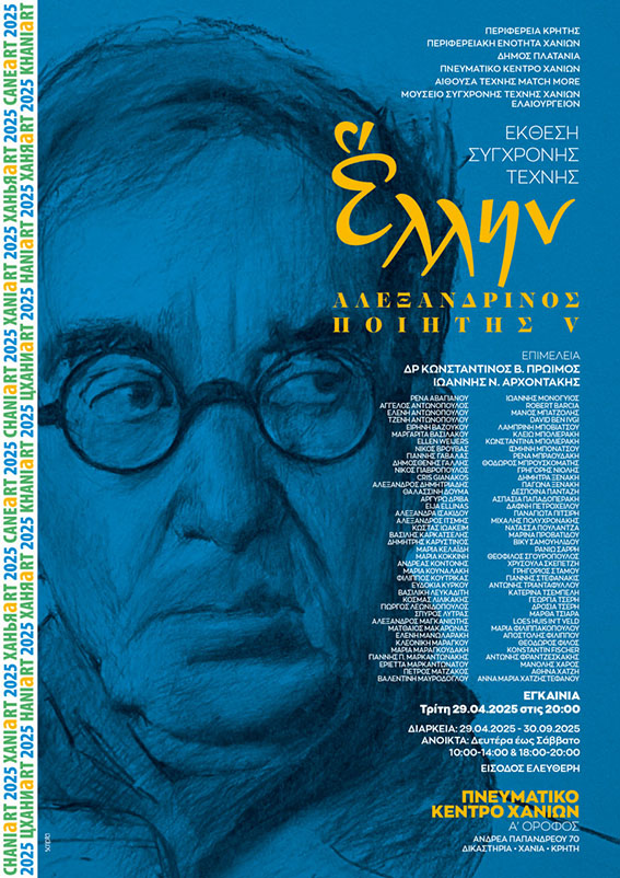 στις 20:30, στις αίθουσες που παρουσιάζεται η έκθεση σύγχρονης τέχνης «Έλλην Αλεξανδρινός Ποιητής V», στον 1ο όροφο του Πνευματικού Κέντρου Χανίων, Ανδρέα Παπανδρέου 70, Χανιά.