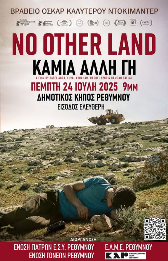 Η Κινηματογραφική Λέσχη Ρεθύμνου, σε συνεργασία με την Ένωση Γιατρών ΕΣΥ Ρεθύμνου, την Ένωση Λειτουργών Μέσης Εκπαίδευσης Ρεθύμνου (Ε.Λ.ΜΕ.Ρ) και την Ένωση Γονέων Μαθητών Δήμου Ρεθύμνου, διοργανώνει μια και μοναδική προβολή της πολυβραβευμένης ταινίας-ντοκιμαντέρ “Καμιά Άλλη Γη / No Other Land” σε μια συμπαραγωγή του 2024 από την Παλαιστίνη και τη Νορβηγία.