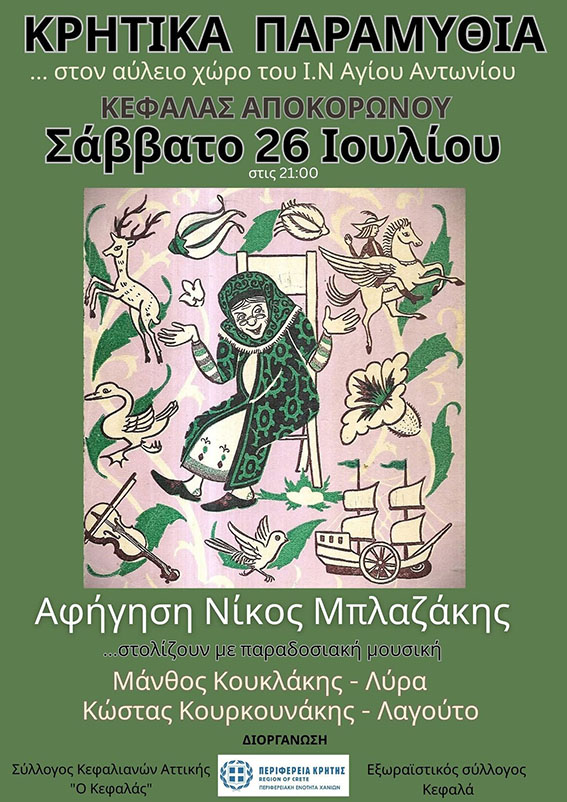 Η εκδήλωση πραγματοποιείται με τη στήριξη της Περιφέρειας Κρήτης – Περιφερειακή Ενότητα Χανίων, σε συνδιοργάνωση με τον Σύλλογο Κεφαλιανών Αττικής “Ο Κεφαλάς” και τον Εξωραϊστικό Σύλλογο Κεφαλά.