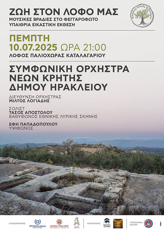 Πιο συγκεκριμένα, την Πέμπτη 10 Ιουλίου και ώρα 21:00, πάνω στον λόφο της Παλιόχωρας, δίπλα στο κάστρο των Κορνάρων, στο βυζαντινό εκκλησάκι της Ζωοδόχου Πηγής και ανάμεσα στους διάσπαρτους ελαιώνες, η Συμφωνική Ορχήστρα Νέων Κρήτης Δήμου Ηρακλείου, υπό τη διεύθυνση του Μίλτου Λογιάδη, με σολίστ τον βαθύφωνο της Εθνικής Λυρικής Σκηνής Τάσο Αποστόλου και την υψίφωνο Έφη Παπαδοπούλου, θα μας ταξιδέψουν με γνώριμα τραγούδια Ελλήνων συνθετών.