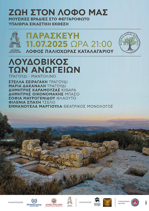 Πριν την έναρξη της συναυλίας της Παρασκευής 11 Ιουλίου, στις 20:00, οι αρχαιολόγοι Ελένη Κανάκη, Γωγώ Μοσχόβη και Νίκος Γιγουρτάκης θα μας ξεναγήσουν στα μνημεία του λόφου: το συγκρότημα των λαξευτών πατητηριών, το μεσαιωνικό φρούριο Κάστελος, αργότερα κάστρο των Κορνάρων (Castello del Cornaro) και τον ναό της Παναγίας Ζωοδόχου Πηγής.