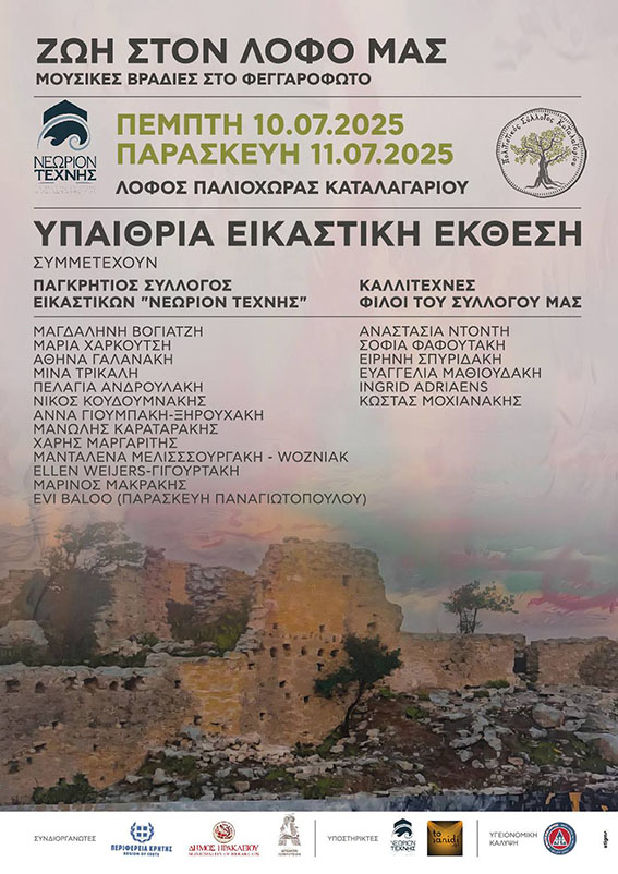 Παράλληλα, και τις δύο ημέρες, στον λόφο της Παλιόχωρας θα λειτουργεί υπαίθρια εικαστική έκθεση με τίτλο “Αναγέννηση”, με έργα του Παγκρήτιου Συλλόγου Εικαστικών Δημιουργών «Νεώριον Τέχνης», καθώς και καλλιτεχνών που είναι φίλοι του Πολιτιστικού Συλλόγου Καταλαγαρίου.