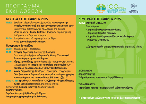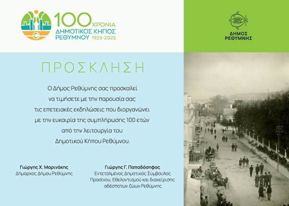 Ο Δήμος Ρεθύμνης διοργανώνει σειρά επετειακών εκδηλώσεων για τα 100 χρόνια λειτουργίας του Δημοτικού Κήπου, ενός τόπου που αποτελεί σημείο αναφοράς για την ιστορία, τον πολιτισμό και την κοινωνική ζωή της πόλης.