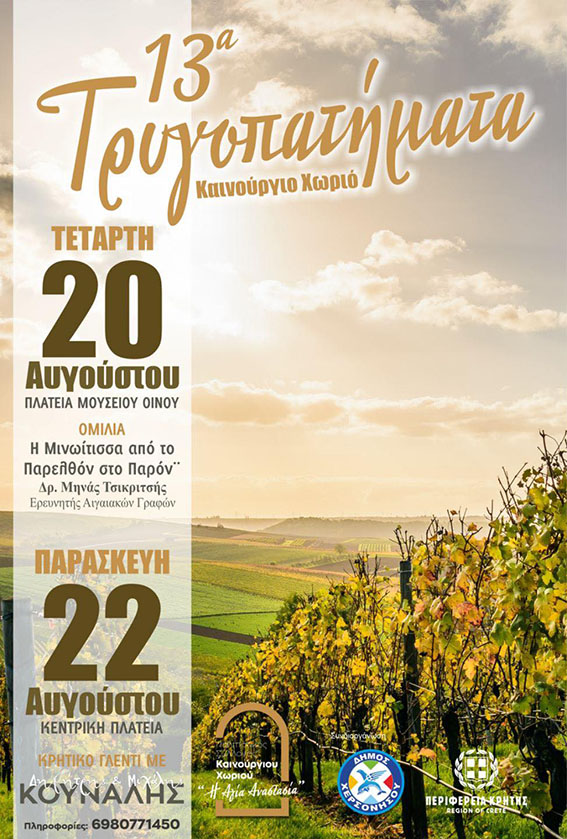 Η εκδήλωση περιλαμβάνει τον τρύγο στο αμπέλι, το πάτημα των σταφυλιών, την παρασκευή μουσταλευριάς, κέρασμα – γευσιγνωσία οίνου και παραδοσιακό κρητικό γλέντι!