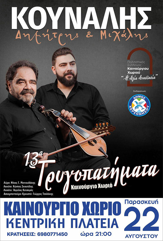 21:30 – Κρητικό παραδοσιακό γλέντι με τους Δημήτρη & Μιχάλη Κουνάλη στην πλατεία του χωριού όπως παλιά.