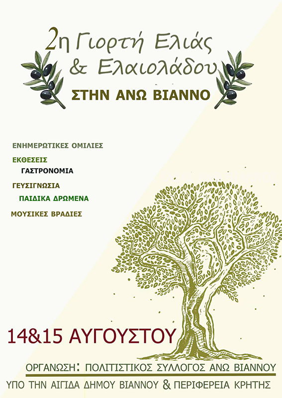 Διοργανωμένη από τον Πολιτιστικό Σύλλογο Άνω Βιάννου, με τη στήριξη του Δήμου Βιάννου, της Περιφέρειας Κρήτης και της Ενορίας Μιχαήλ Αρχαγγέλου, η γιορτή φιλοδοξεί να βάλει το εξαιρετικό παρθένο ελαιόλαδο στο επίκεντρο του ενδιαφέροντος.