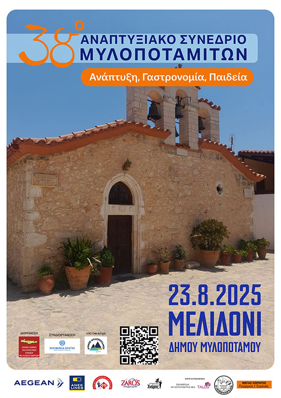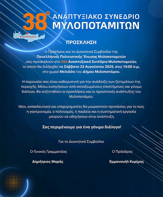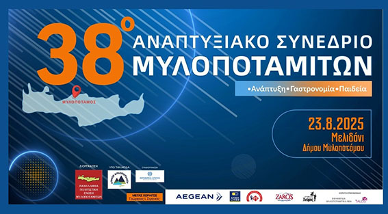 Η «Πανελλήνια Πολιτιστική Ένωση Μυλοποταμιτών», με τη στήριξη της Περιφέρειας Κρήτης και υπό την αιγίδα του Δήμου Μυλοποτάμου, πραγματοποιεί το 38ο Αναπτυξιακό Συνέδριο Μυλοποταμιτών, το