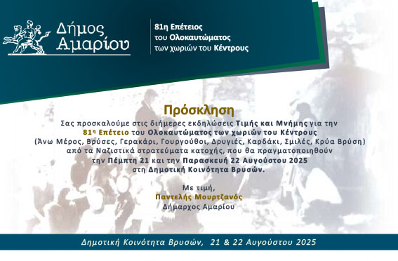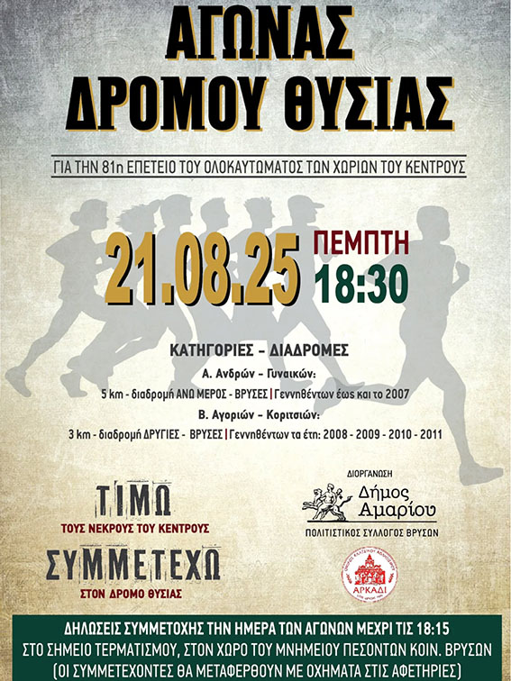 Ο Αγώνας Δρόμου Θυσίας επιστρέφει και φέτος στο Αμάρι, την Πέμπτη 21 Αυγούστου 2025, με ώρα εκκίνησης τις 18:30, τιμώντας την 81η Επέτειο του Ολοκαυτώματος των χωριών του Κέντρους.
