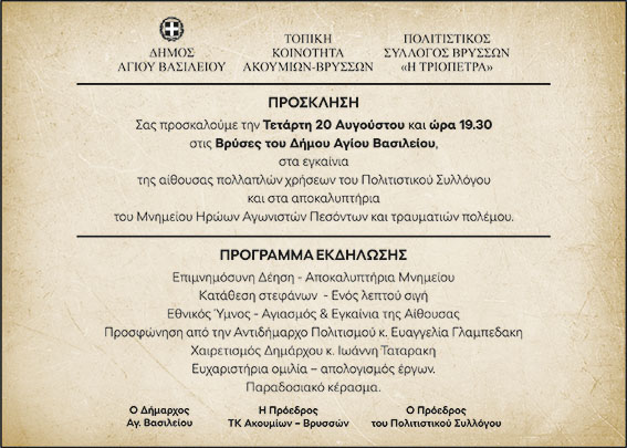 Η εκδήλωση πραγματοποιείται από τον Δήμο Αγίου Βασιλείου, την Τοπική Κοινότητα Ακουμίων – Βρυσών και τον Πολιτιστικό Σύλλογο Βρυσών “Η Τριόπετρα”, ως φόρος τιμής στους ήρωες του τόπου.