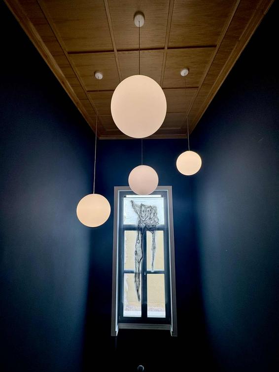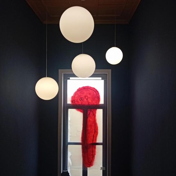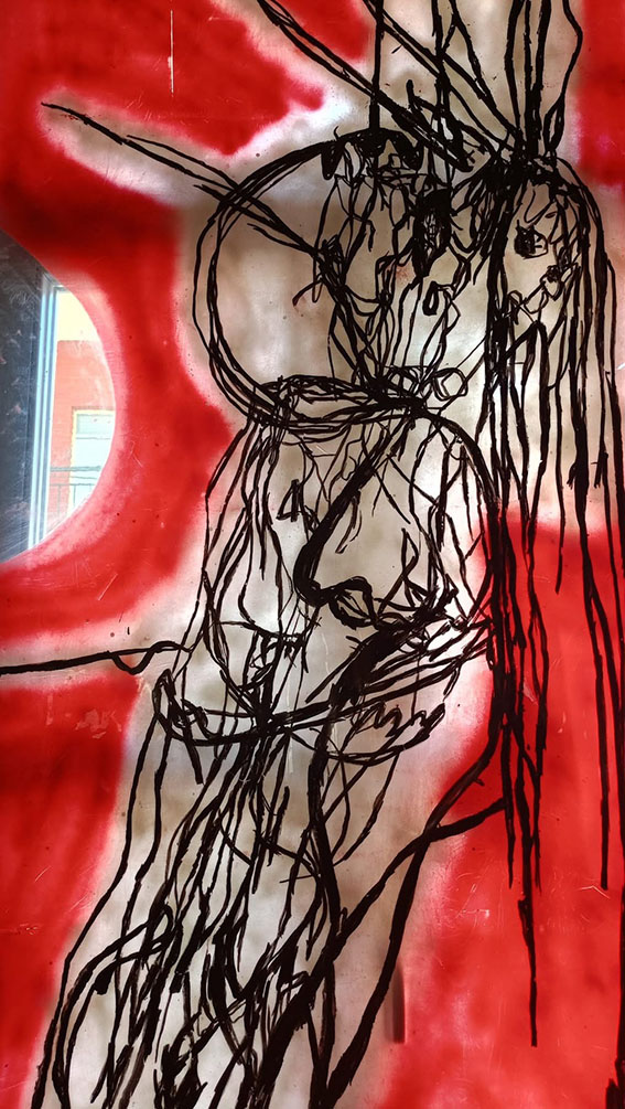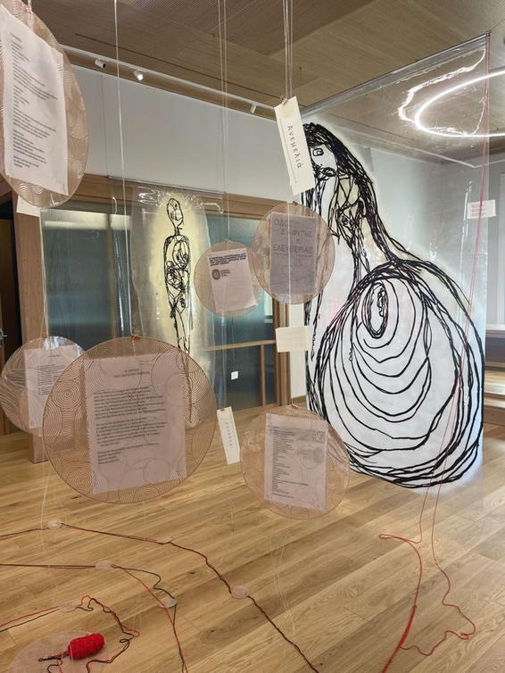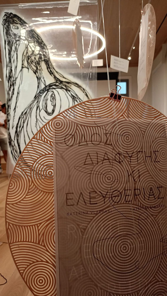 Δύο νέες γυναίκες δημιουργοί με διαφορετικό καλλιτεχνικό κώδικα συναντήθηκαν σε βαθύτερα επίπεδα νοηματοδοτήσεων με μια διάφανη αιώρηση με γραμμές και γραφές σε τροχιά καμπύλης που υπονοεί τη σύνδεση και ταυτόχρονα το άνοιγμα.