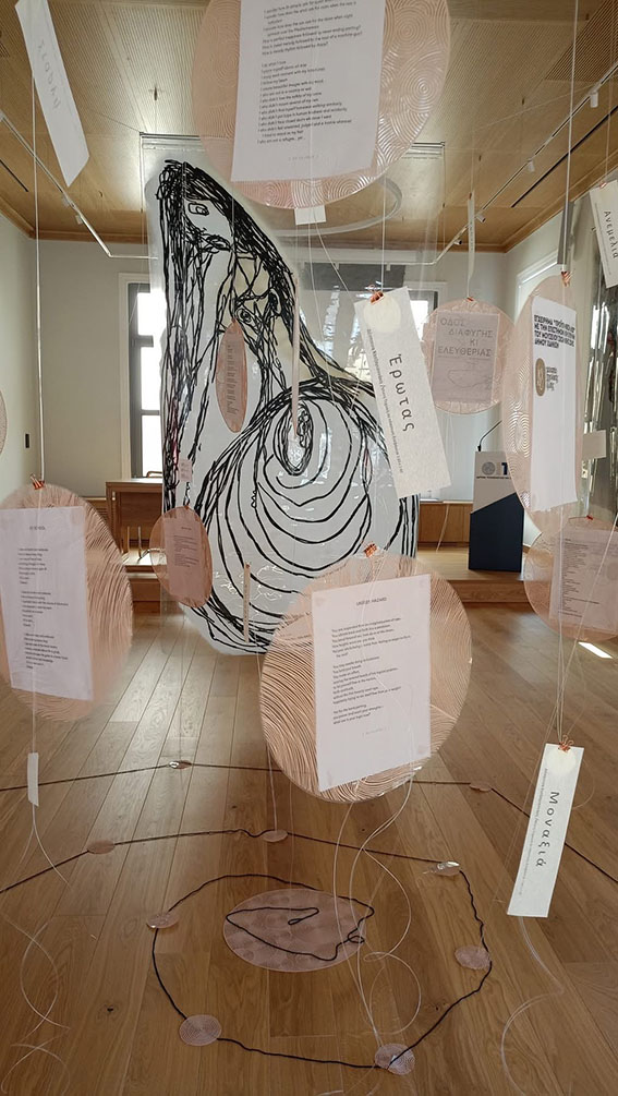 Παράλληλα, μέσα από την εγκατάσταση «ΧΟΡΕΥΟΥΜΕ;», οι θεατές κλήθηκαν να συμμετάσχουν σε μια εσωτερική περιήγηση, σε έναν «χορό» ελεύθερης ερμηνείας και ενσώματης εμπειρίας. Οι λέξεις της ποιήτριας αιωρούμενες σε ρυζόχαρτο και μετουσιώθηκαν σε χέρια χορευτών που ανασύρουν και οδηγούν ελεύθερα τη μαύρη σπείρα της ζωγράφου – μια μορφή ενέργειας που ρέει και αφηγείται.