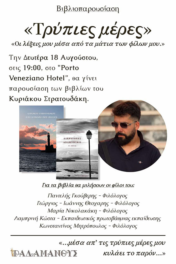στις 7 το απόγευμα, στο Porto Veneziano Hotel, στο Ενετικό Λιμάνι των Χανίων. Για τα βιβλία θα μιλήσουν οι φιλόλογοι: