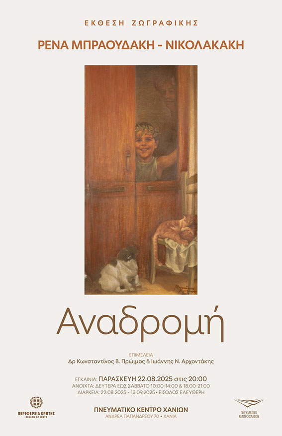 Η Περιφέρεια Κρήτης – Περιφερειακή Ενότητα Χανίων και το Πνευματικό Κέντρο Χανίων παρουσιάζουν την έκθεση ζωγραφικής της Ρένας Μπραουδάκη – Νικολακάκη με τίτλο «Αναδρομή», η οποία εγκαινιάζεται την