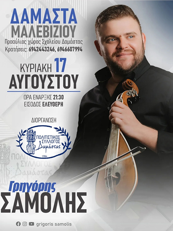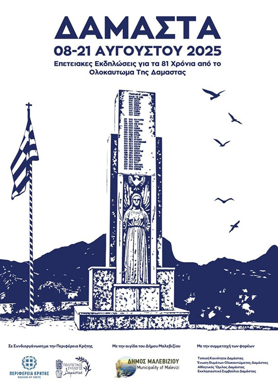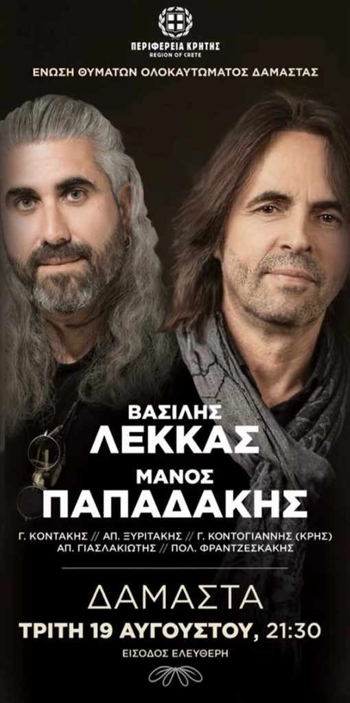 Η Ένωση Θυμάτων Ολοκαυτώματος Δαμάστας σε συνδιοργάνωση με την Περιφέρεια Κρήτης διοργανώνει συναυλία στον προαύλιο χώρο του Δημοτικού Σχολείου Δαμάστας με το συγκρότημα του