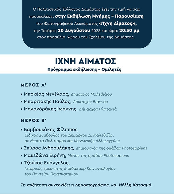Παρουσίαση του φωτογραφικού λευκώματος “Ίχνη Αίματος”, μια πρωτοβουλία του Δήμου Μαλεβιζίου φόρος τιμής στα μαρτυρικά χωριά Σάρχος και Δαμάστα.