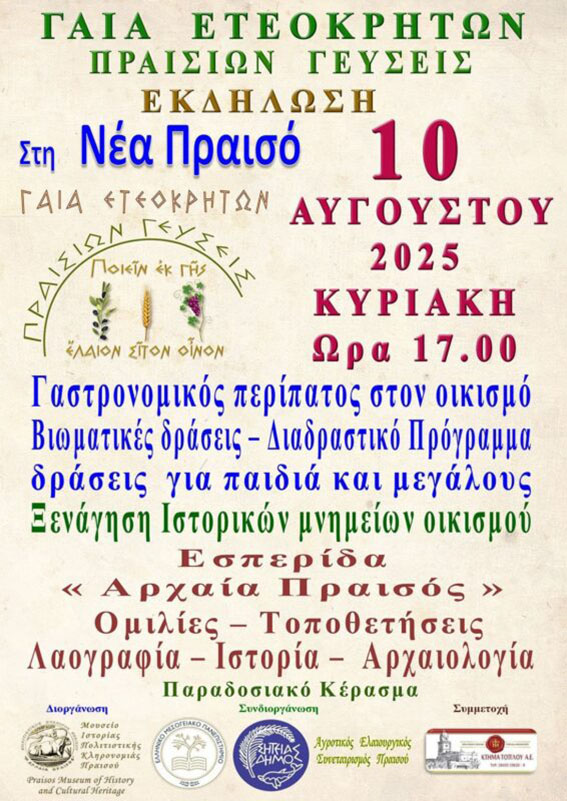 Το Μουσείο Ιστορίας – Πολιτιστικής Κληρονομιάς Πραισού και ο Δήμος Σητείας, με τη στήριξη του Ελληνικού Μεσογειακού Πανεπιστημίου – Τμήματος Επιστημών Διατροφής & Διαιτολογίας Σητείας, διοργανώνουν τη γαστρονομική εκδήλωση ΓΑΙΑ ΕΤΕΟΚΡΗΤΩΝ «Πραισίων Γεύσεις».