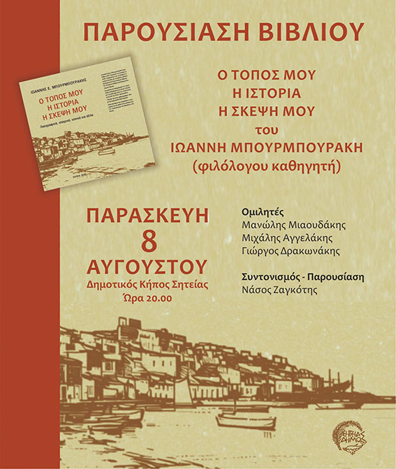 Στο πλαίσιο των καθιερωμένων πολιτιστικών εκδηλώσεων “Κορνάρεια” του Δήμου Σητείας, θα πραγματοποιηθεί την Παρασκευή 8 Αυγούστου 2025, στις 20:00, η παρουσίαση του νέου βιβλίου του φιλολόγου και καθηγητή Ιωάννη Μπουρμπουράκη, με τίτλο: