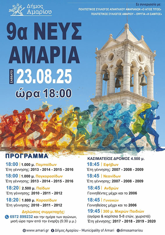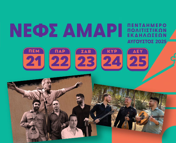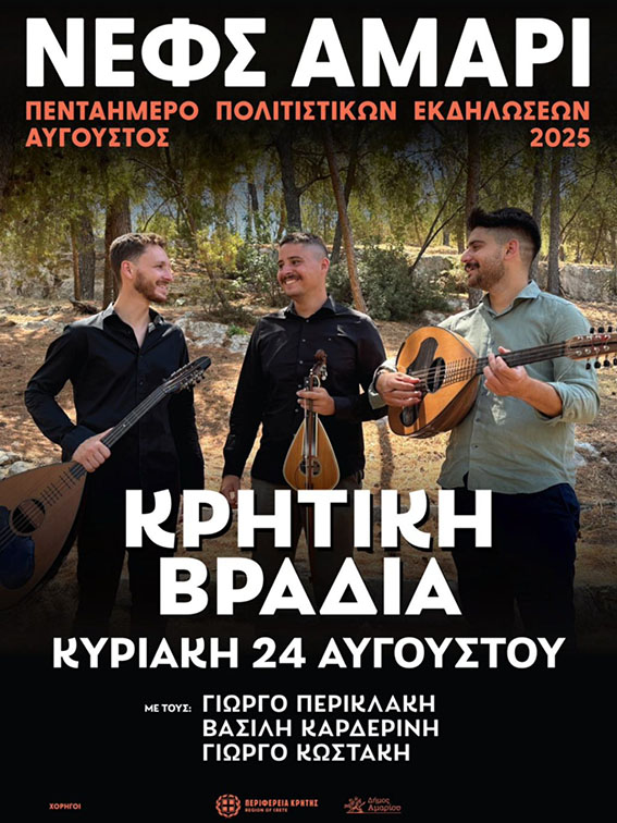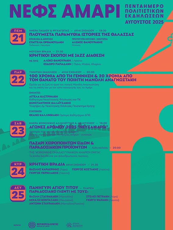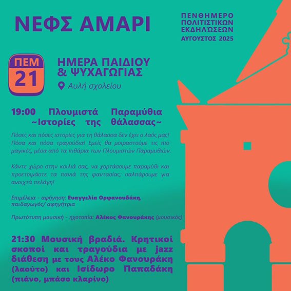 Οι εκδηλώσεις ξεκινούν με μια μέρα αφιερωμένη στα παιδιά… και όχι μόνο! Το ορεινό τοπίο του Αμαρίου θα «συναντήσει» τη θάλασσα μέσα από λαϊκές αφηγήσεις και τραγούδια, ενώ η βραδιά θα συνεχιστεί σε πρωτότυπους ρυθμούς Κρητικής Τζαζ, χαρίζοντας στο κοινό μια σπάνια μουσική εμπειρία.