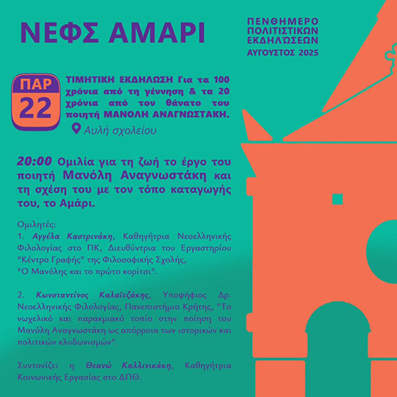 Με αφορμή τα 100 χρόνια από τη γέννηση και τα 20 χρόνια από τον θάνατο του σπουδαίου ποιητή Μανώλη Αναγνωστάκη, το Αμάρι τιμά τον λογοτέχνη που κατάγεται από τον τόπο.