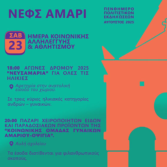 Αμέσως μετά, στην πλατεία, θα πραγματοποιηθεί παζάρι χειροτεχνίας και παραδοσιακών προϊόντων, με τη φροντίδα της Κοινωνικής Ομάδας Γυναικών Αμαρίου – Οψιγιά. Όλα τα έσοδα θα διατεθούν για φιλανθρωπικούς σκοπούς.