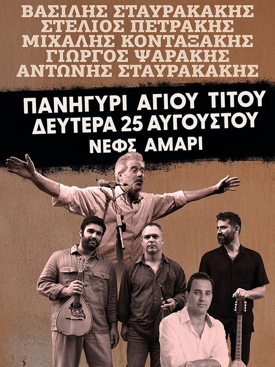 Στη σκηνή ανεβαίνει ο Βασίλης Σταυρακάκης, μία από τις σημαντικότερες φωνές της σύγχρονης κρητικής μουσικής, σε ένα γλέντι με άρωμα παράδοσης.