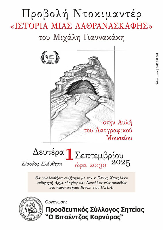 Στις 20:30, θα προβληθεί το ντοκιμαντέρ του σκηνοθέτη Μιχάλη Γιαννακάκη με τίτλο «Ιστορία μιας λαθρανασκαφής».
