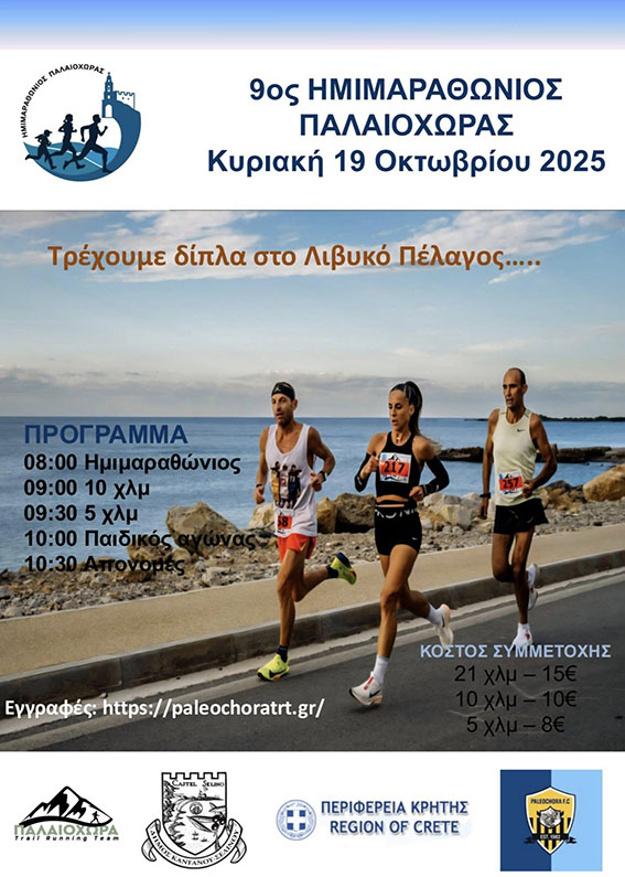 Ο 9ος Ημιμαραθώνιος Παλαιόχωρας σας καλεί να γίνετε μέρος μιας μοναδικής αθλητικής εμπειρίας που συνδυάζει τρέξιμο, φύση και την αυθεντική φιλοξενία της Κρήτης.