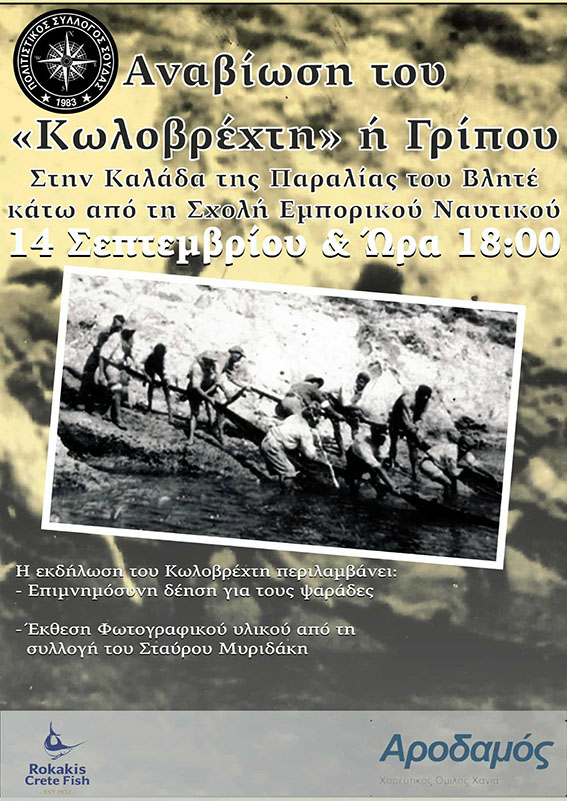 Ο Πολιτιστικός Σύλλογος Σούδας προσκαλεί όλους τους φίλους του πολιτισμού και της παράδοσης στην αναβίωση του εθίμου «Κωλοβρέχτης» ή «Γρίπος», που θα πραγματοποιηθεί την