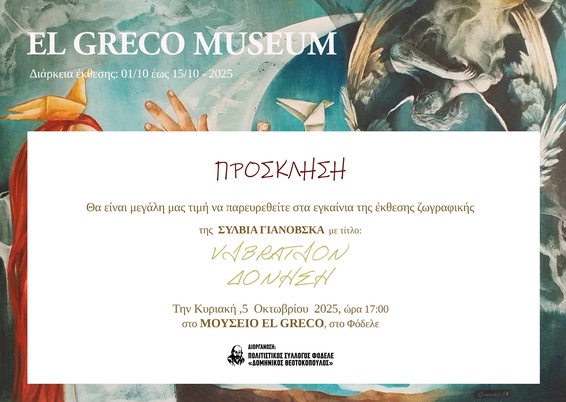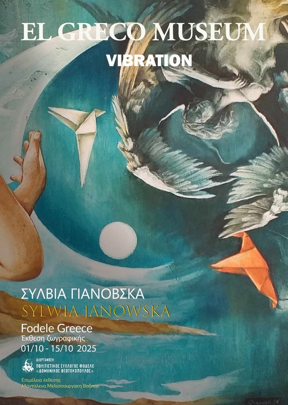 Ο Πολιτιστικός Σύλλογος Φόδελε «Δομήνικος Θεοτοκόπουλος» με ιδιαίτερη χαρά φιλοξενεί τη νέα έκθεση της εικαστικού Σύλβια Γιανόβσκα, με τίτλο «VIBRATION». Η έκθεση, σε επιμέλεια της Μανταλένας Μελισσουργάκη Βόζνιακ, θα διαρκέσει από την