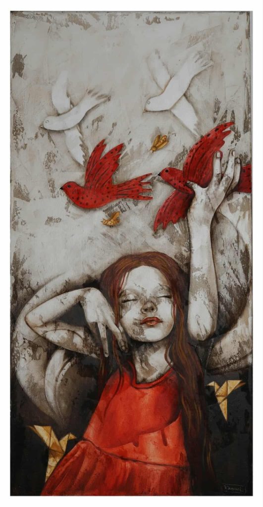 Κεντρική θέση στους πίνακές της έχουν τα πουλιά, που εμφανίζονται άλλοτε καθαρά κι άλλοτε αχνά. Συμβολίζουν την παρουσία της καλλιτέχνιδας μέσα στη ροή των ιδεών, σαν μια σιωπηλή συζήτηση με τους Έλληνες δημιουργούς που τη σημάδεψαν.