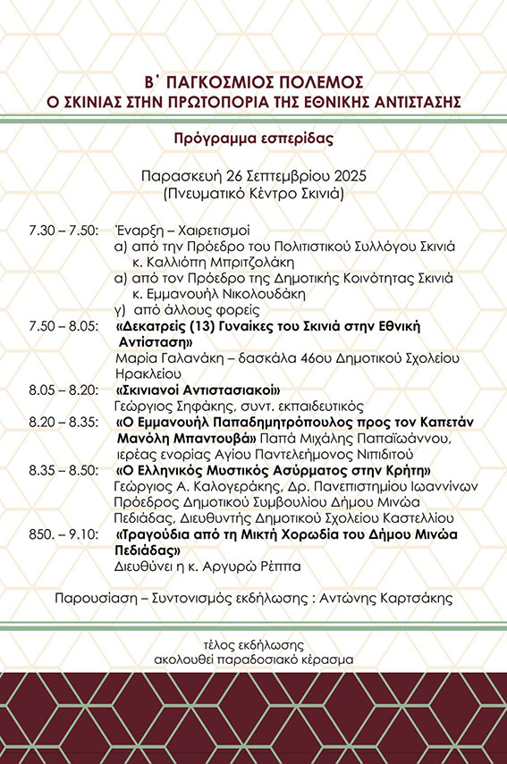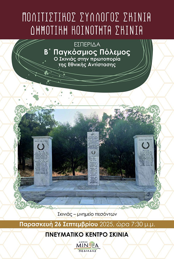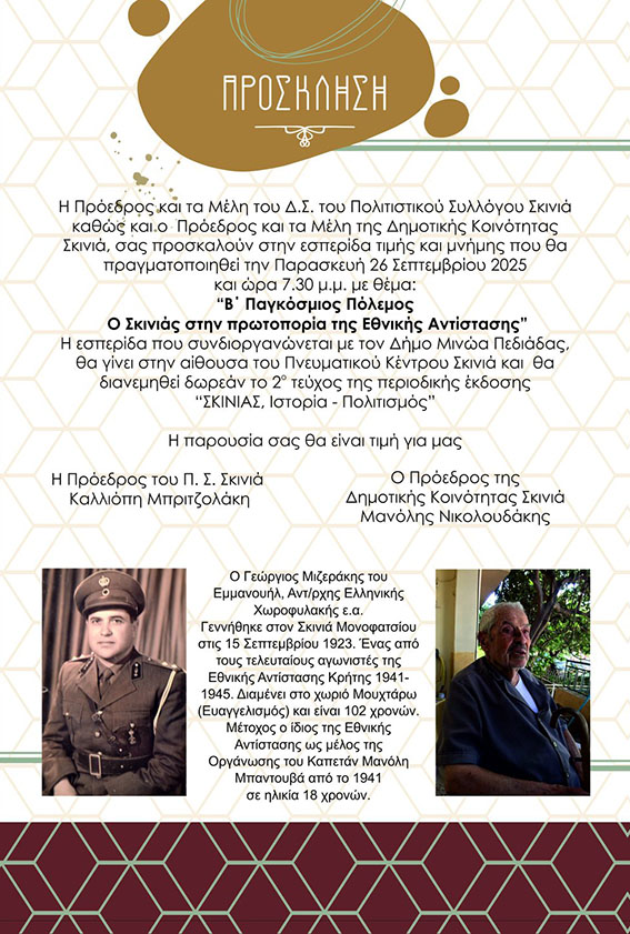 Ο Πολιτιστικός Σύλλογος και η Δημοτική Κοινότητα Σκινιά, με την υποστήριξη του Δήμου Μινώα Πεδιάδας, διοργανώνουν εσπερίδα τιμής και μνήμης με θέμα: