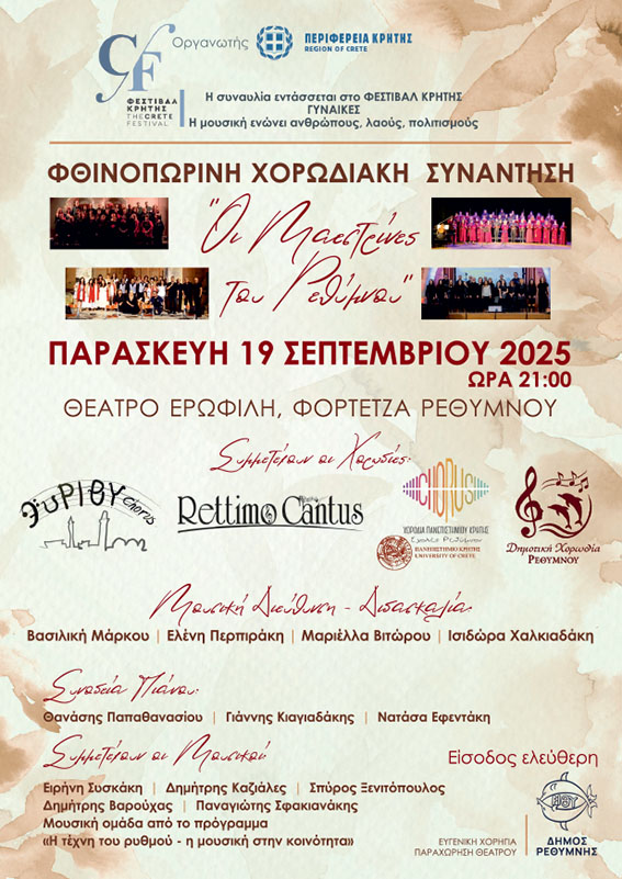 Η Περιφέρεια Κρήτης διοργανώνει τη Φθινοπωρινή Χορωδιακή Συνάντηση – «Οι Μαεστρίνες του Ρεθύμνου» την