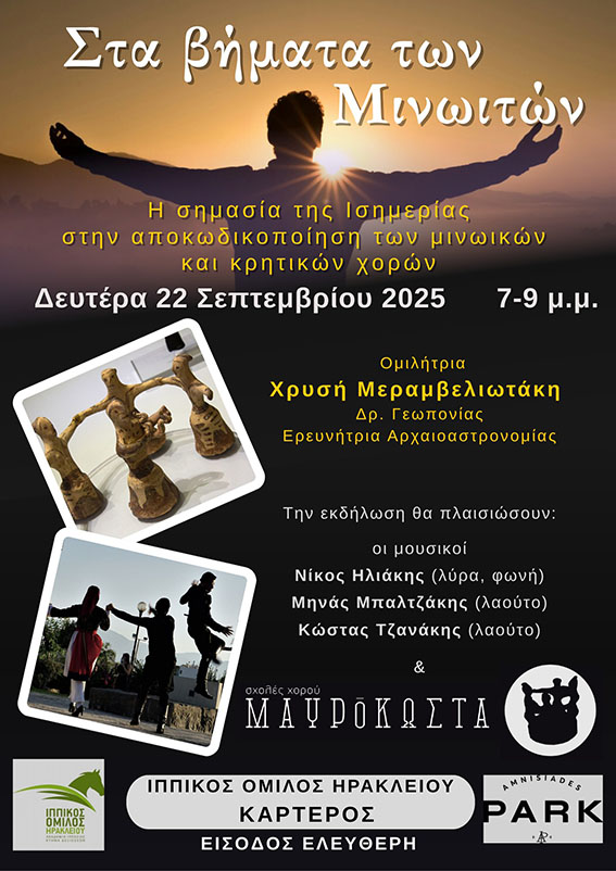 Ο ρυθμός της μουσικής και του χορού, ακολουθώντας αιώνες τώρα την πορεία του Ήλιου, της Σελήνης και των πλανητών, γίνεται η γέφυρα που ενώνει το χθες με το σήμερα. Οι κρητικοί χοροί ανακαλούν μινωικά μοτίβα, αποκαλύπτοντας την ουράνια σοφία και τις γνώσεις των προγόνων μας.
